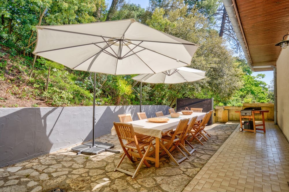La villa se situe au fond de l'impasse. Des places de stationnement gratuites sont disponibles pour vous garer juste devant.